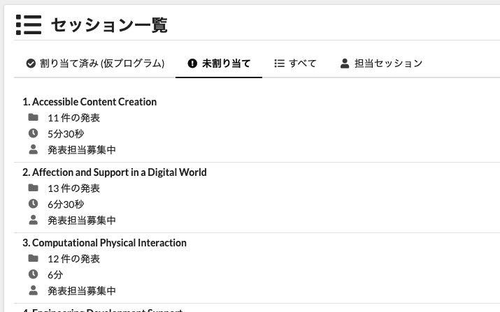 セッション一覧が表示されます。担当発表募集中となっているセッションの中から、担当したいセッションを探します。