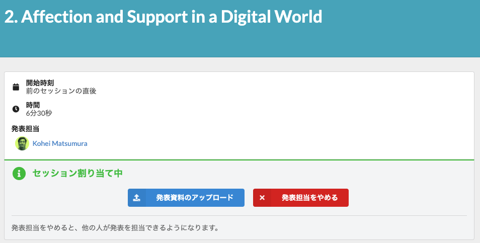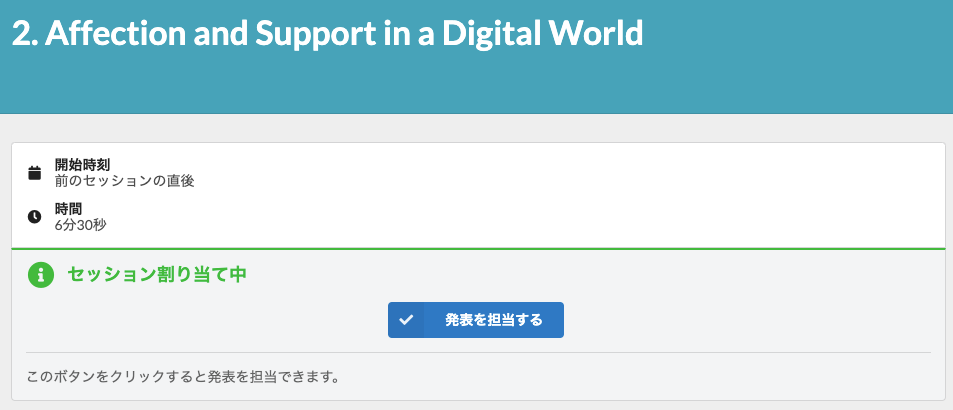 例えば、2. Affection and Support in a Digital Worldを選びます。以下のような画面になるので、担当をしたい場合は「発表を担当する」ボタンを押します。